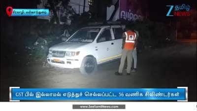 மயிலாடுதுறை மாவட்டம் சீர்காழி அருகே, உரிய ஜி.எஸ்.டி .பில் இல்லாமல் எடுத்துச் செல்லப்பட்ட 56 வணிக சிலிண்டர்கள் சரக்கு வாகனத்துடன் பறிமுதல் செய்யப்பட்டன.