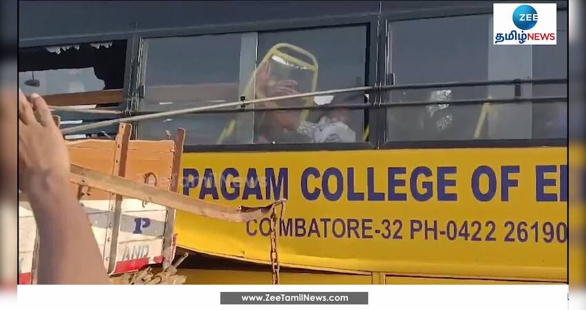 கோவை அருகே கல்லூரி பேருந்து லாரி மீது மோதி விபத்துக்குள்ளானது.