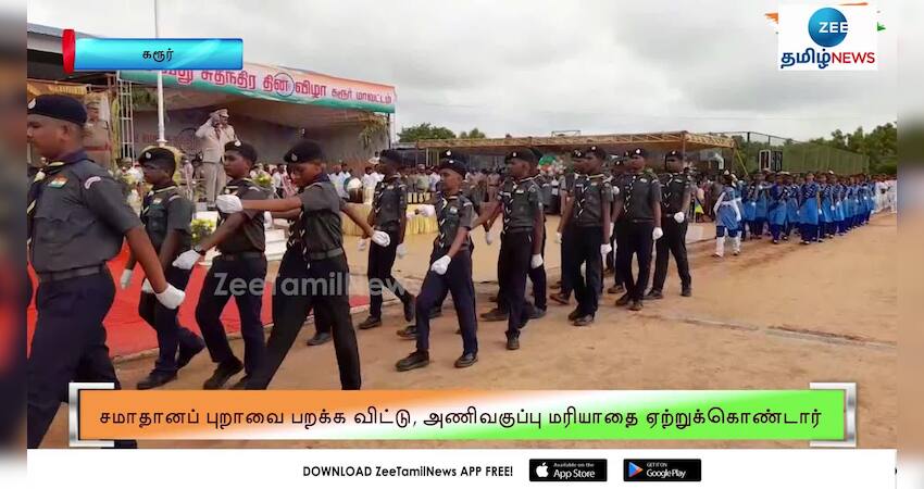 78 ஆவது சுதந்திர தினவிழாவையொட்டி கரூரில் தேசியக் கொடி ஏற்றி மாவட்ட ஆட்சியர் சமாதானப் புறாக்களை பறக்க விட்டார்.