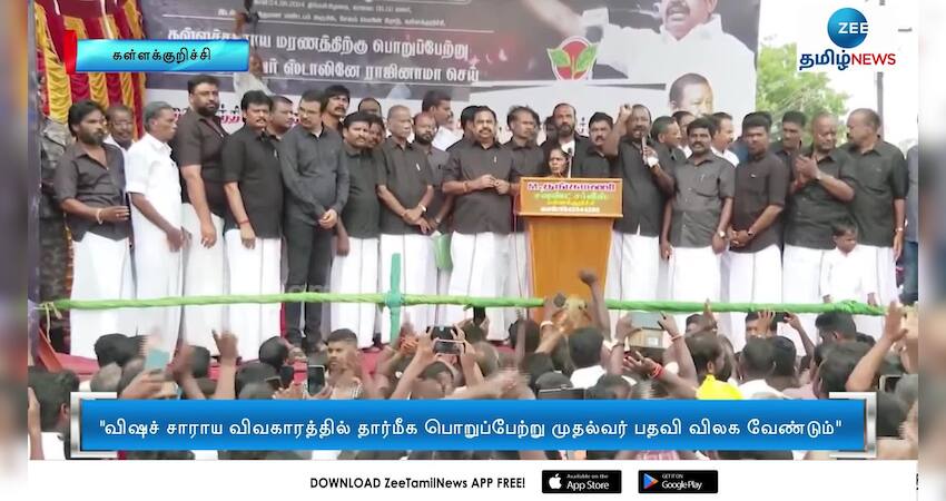 விஷச் சாராய விவகாரத்தில் தார்மீக பொறுப்பேற்று முதலமைச்சர் மு.க.ஸ்டாலின் பதவி விலகக் கோரி அதிமுகவினர் ஆர்ப்பாட்டத்தில் ஈடுபட்டனர்.