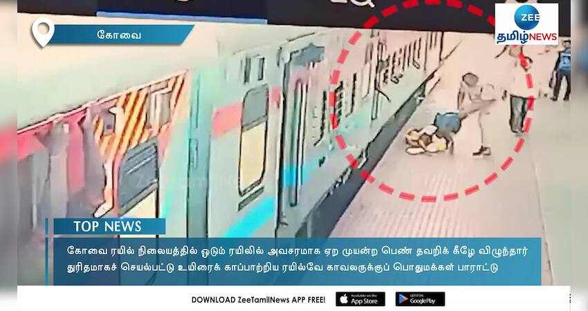 கோவையில் ஓடும் ரயிலில் இருந்து தவறி விழுந்த பெண்ணை ரயில்வே காவலர் காப்பாற்றியுள்ளார்.