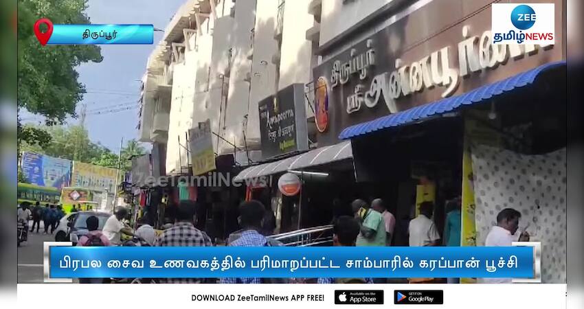திருப்பூரில் உள்ள பிரபல சைவ உணவகத்தில் சாம்பாரில் கரப்பான் பூச்சி இருந்ததால் பொதுமக்கள் அதிர்ச்சி அடைந்தனர்.