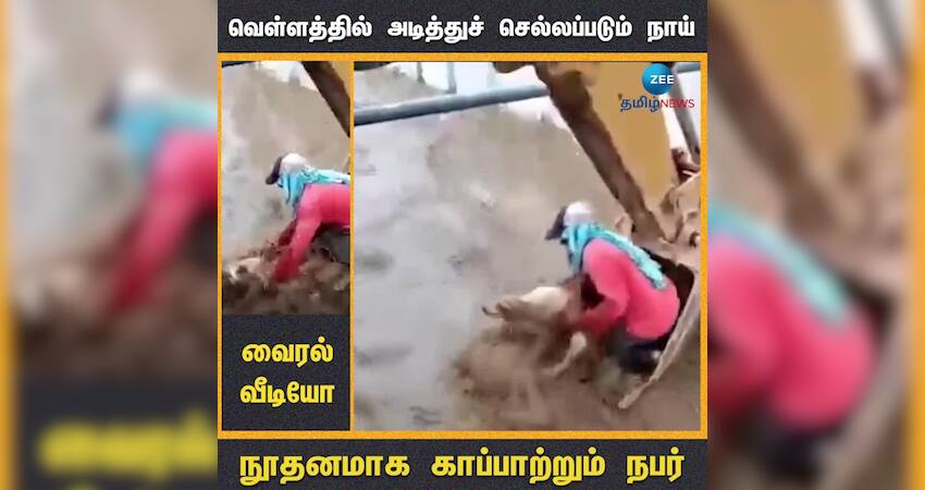 வெள்ளத்தில் அடித்துச் செல்லப்பட்ட நாயை பத்திரமாக மீட்ட நபர்