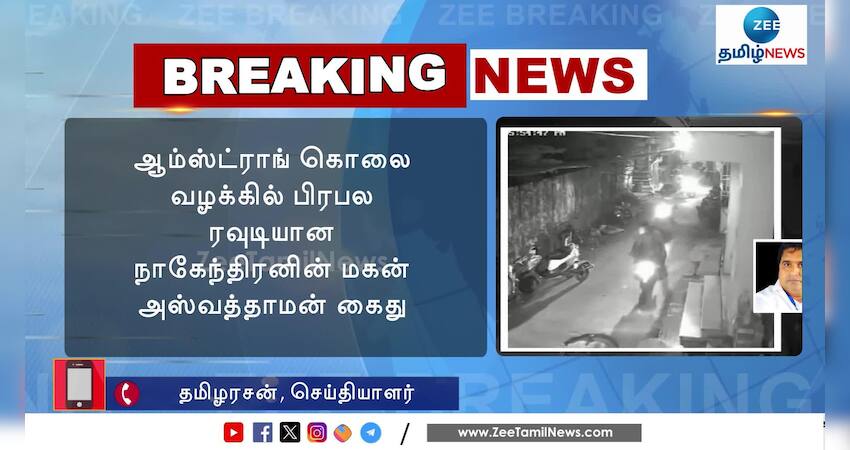 ஆம்ஸ்ட்ராங் கொலை வழக்கில் பிரபல ரவுடியான நாகேந்திரனின் மகன் அஸ்வத்தாமன் கைது; ஆம்ஸ்ட்ராங் கொலை வழக்கில் அருணை போலீஸ் காவலில் விசாரித்தபோது அஸ்வத்தாமனுக்கு தொடர்பு உள்ளது தெரியவந்தது.