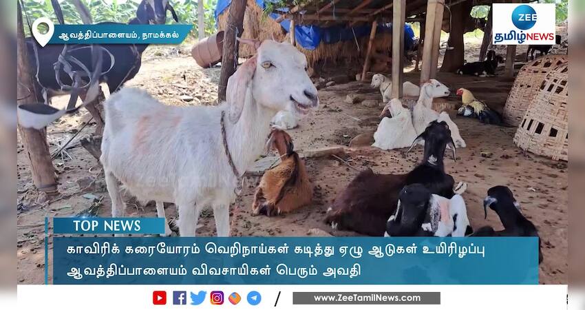நாமக்கல் மாவட்டம் ஆவத்திப்பாளையம் காவிரி கரையோரம் வெறிநாய்கள் கடித்து ஏழு ஆடுகள் பரிதாபமாக உயிரிழந்து கிடந்த சம்பவம் பெரும் பரபரப்பை ஏற்படுத்தியுள்ளது.