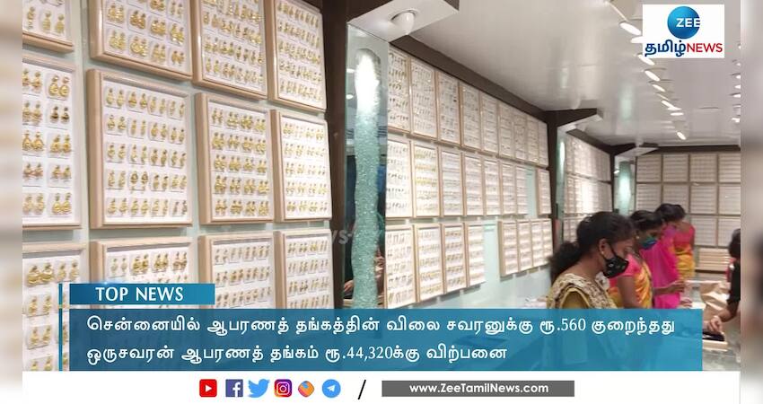 சென்னையில் ஆபரணத் தங்கத்தின் விலை ஒரு சவரனுக்கு ரூ. 560 குறைந்துள்ளது. 2ஆவது நாளாக விலை குறைந்துள்ள நிலையில், ஆபரணத்தங்கம் ஒரு சவரனுக்கு ரூ. 44,320 ஆக விற்பனை செய்யப்படுகிறது.