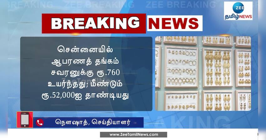 சென்னையில் ஆபரணத் தங்கம் சவரனுக்கு ரூ.760 உயர்ந்தது; மீண்டும் ரூ.52,000ஐ தாண்டியது; சென்னையில் 22 கேரட் ஆபரணத் தங்கம் சவரனுக்கு ரூ.760 உயர்ந்து ரூ.52,520-க்கு விற்பனை.