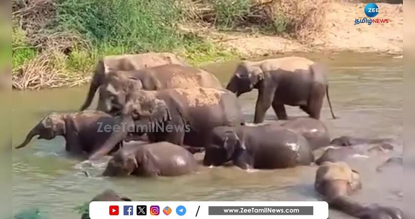 கிருஷ்ணகிரி மாவட்டம் ஓசூர் அடுத்த தேன்கனிக்கோட்டை அருகே சுமார் 50க்கும் மேற்பட்ட யானைகள் முகாமிட்டுள்ள நிலையில், நீர்நிலையில் ஆனந்த குளியல் போட்ட 10 க்கும் மேற்பட்ட யானைகள்.