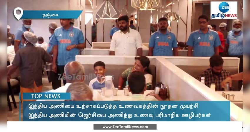 உலகக்கோப்பை கிரிக்கெட் இறுதிப் போட்டியின் எதிரொலியாக தஞ்சை உணவகத்தில் இந்திய அணியின் ஜெர்சியை அணிந்து வாடிக்கையாளர்களுக்கு ஊழியர்கள் உணவு பரிமாறினர்