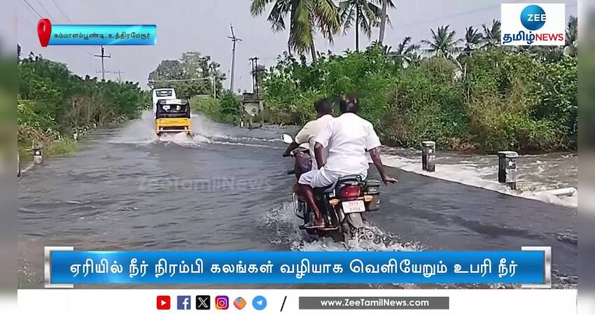 காஞ்சிபுரம் உத்திரமேரூரில் கனமழையால் நிரம்பிய ஏரியில் இருந்து தண்ணீர் கரைபுரண்டு ஓடுகிறது.