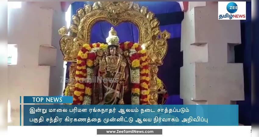 இன்று நள்ளிரவு பகுதி சந்திர கிரகணம் நடைபெறுவதை முன்னிட்டு மயிலாடுதுறை பரிமள ரங்கநாதர் ஆலயம் மாலை 6 மணிக்கு நடை சாத்தப்படும் என ஆலய நிர்வாகம் அறிவித்துள்ளது.