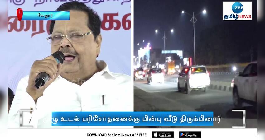 அமைச்சர் துரைமுருகனுக்கு திடீர் உடல்நலக் குறைவு ஏற்பட்ட நிலையில், வேலூரில் உள்ள தனியார் மருத்துவமனையில் ஒரு மணி நேர முழு உடல் பரிசோதனைக்கு பின்பு வீடு திரும்பினார்.