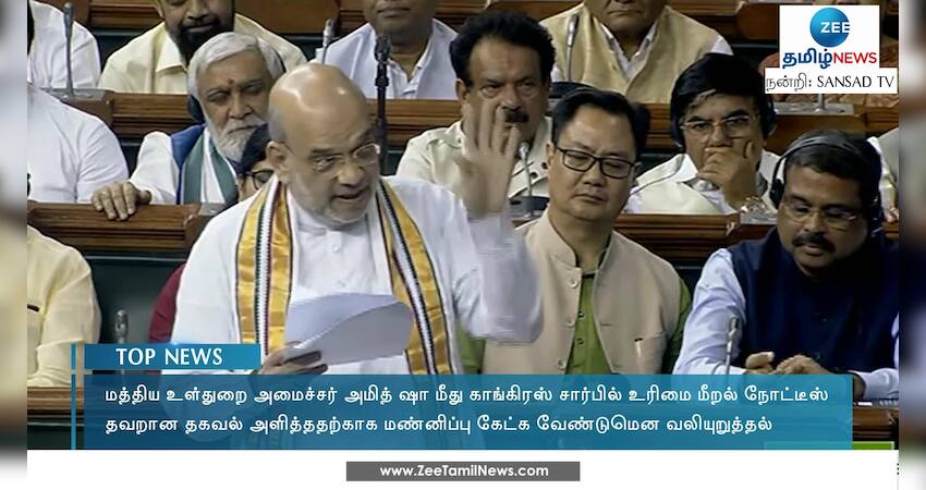 மத்திய உள்துறை அமைச்சர் அமித் ஷா மீது நடவடிக்கை எடுக்கக்கோரி காங்கிரஸ் சார்பில் உரிமை மீறல் நோட்டீஸ் வழங்கப்பட்டது.