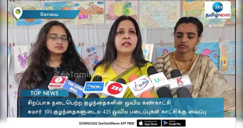 கோவை ஆர்.எஸ்.புரம் பகுதியில் நடைபெற்ற ஓவிய கண்காட்சியில் சுமார் 100 குழந்தைகளுடைய 425 ஓவிய படைப்புகள் காட்சிபடுத்தப்பட்டன.
