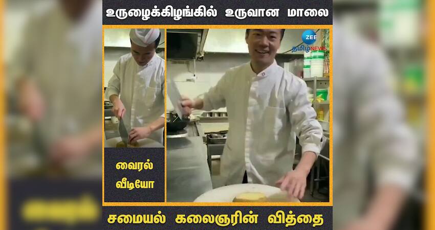 சமையல் கலைஞர் ஒருவர் கத்தியில் செய்யும் உருளைக் கிழங்கு மாலை வியக்க வைக்கிறது