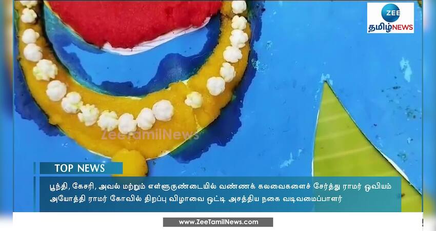 கோவையைச் சேர்ந்த நகை வடிவமைப்பாளர் ஒருவர், ராமருக்குப் பிரசாதமாகப் படைக்கும் இனிப்புகளைக் கொண்டு ராமரின் உருவத்தை வரைந்து அசத்தியுள்ளார்.