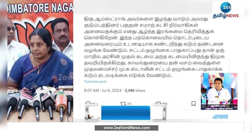 பகுஜன் சமாஜ் கட்சியின் மாநிலத் தலைவர் ஆம்ஸ்ட்ராங் படுகொலைக்குக் காரணமான அனைவருக்கும் கடும் தண்டனை வழங்க வேண்டும் என்று பாஜக தேசிய மகளிர் அணித் தலைவர் வானதி சீனிவாசன் வலியுறுத்தியுள்ளார்.