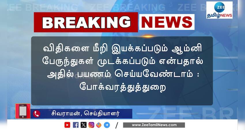 தமிழக அரசின் அனுமதி இல்லாத ஆம்னி பேருந்துகளில் பயணிகள் முன்பதிவு செய்ய வேண்டாம்; பிற மாநில ஆம்னி பேருந்துகளில் முன்பதிவு செய்துள்ள பயணிகள் உடனடியாக ரத்து செய்ய போக்குவரத்துத்துறை அறிவுறுத்தி உள்ளது.