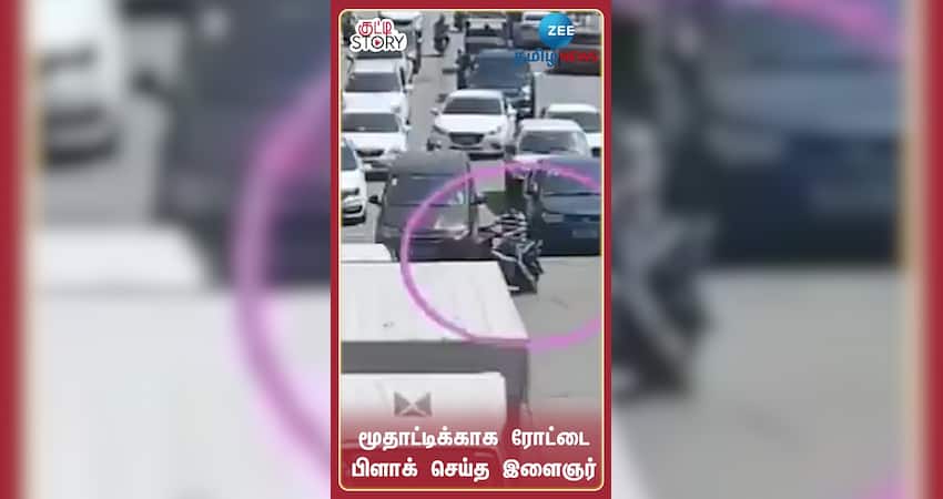 மூதாட்டி சாலையை கடப்பதற்காக இளைஞர் ஒருவர் சாலையை பிளாக் செய்துள்ளார்.
