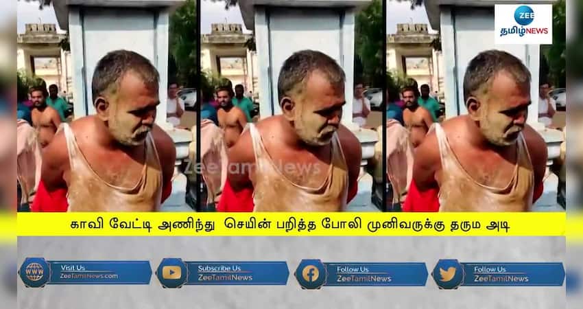 காவி வேட்டி அணிந்து பக்தர் போல் நடித்து செயின் பறிப்பில் ஈடுபட்டவரை, கோயிலில் கட்டி வைத்து தர்மடி கொடுத்து, காவல்துறையிடம் பொதுமக்கள் ஒப்படைத்தனர்.