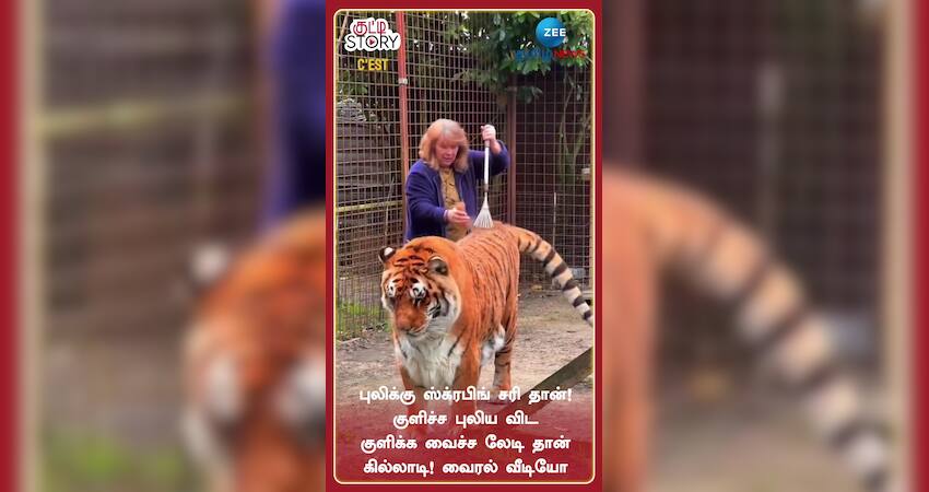 புலிக்கு ஸ்க்ரபிங் சரி தான்! குளிச்ச புலிய விட குளிக்க வைச்ச லேடி தான் கில்லாடி! வைரல் வீடியோ
