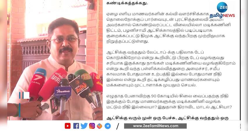 தமிழ்நாட்டின் அனைத்து மாணவர்களுக்கும் மடிக்கணினியை இலவசமாக வழங்க வேண்டும் என திமுக அரசை, அமமுக பொதுசெயலாளர் டிடிவி தினகரன் வலியுறுத்தியுள்ளார்.