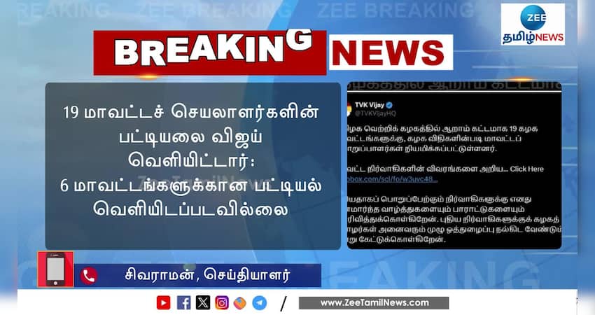 தமிழக வெற்றிக் கழகத்தின் 19 மாவட்டச் செயலாளர்களின் பட்டியலை அக்கட்சியின் தலைவர் விஜய் வெளியிட்டார். 6 மாவட்டங்களுக்கான பட்டியல் வெளியிடப்படவில்லை.