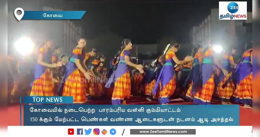 கோவையில் நடைபெற்ற வள்ளி கும்மியாட்டம் அரங்கேற்ற நிகழ்ச்சியில் 150 க்கும் மேற்பட்ட பெண்கள் பங்கேற்று - வண்ண ஆடைகளுடன் நடனம் ஆடினர்.