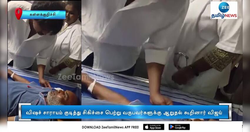 விஷச் சாராயம் குடித்து மருத்துவமனையில் அனுமதிக்கப்பட்டு சிகிச்சை பெற்று வருபவர்களைத் தமிழக வெற்றிக் கழகத் தலைவர் விஜய் நேரில் சந்தித்து நலம் விசாரித்தார்.