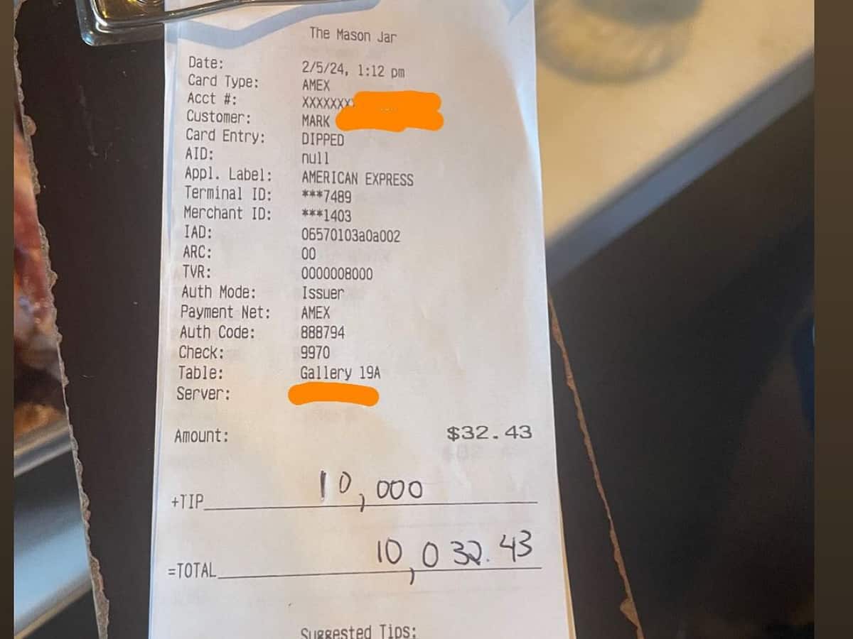 அமெரிக்காவின் மிச்சிகன் நகரில் உள்ள மேசன் ஜார் கேப் (Mason Jar Cafe) என்ற உணவகத்தில் மார்க் என்ற வாடிக்கையாளர் சில தினங்களுக்கு முன் உணவருந்த சென்றிருக்கிறார். அவர் மொத்தம் 32.43 அமெரிக்க டாலருக்கு உணவருந்தியுள்ளார். உணவகம் அவருக்கு அளித்த பில்லில் டிப்ஸ் பகுதியில் 10 ஆயிரம் அமெரிக்க டாலர் என்று எழுதியுள்ளார். அவர் சாப்பிட்ட தொகையில் இருந்து அவர் டிப்ஸ் கொடுத்த தொகை 30,835% அதிகம். அதாவது இந்திய மதிப்பில் மைக் 2 ஆயிரத்து 691 ரூபாய்க்கு சாப்பிட்டுள்ளார். ஆனால் 8 லட்சத்து 29 ஆயிரத்து 883 ரூபாயை டிப்ஸாக வழங்கி உள்ளார்.