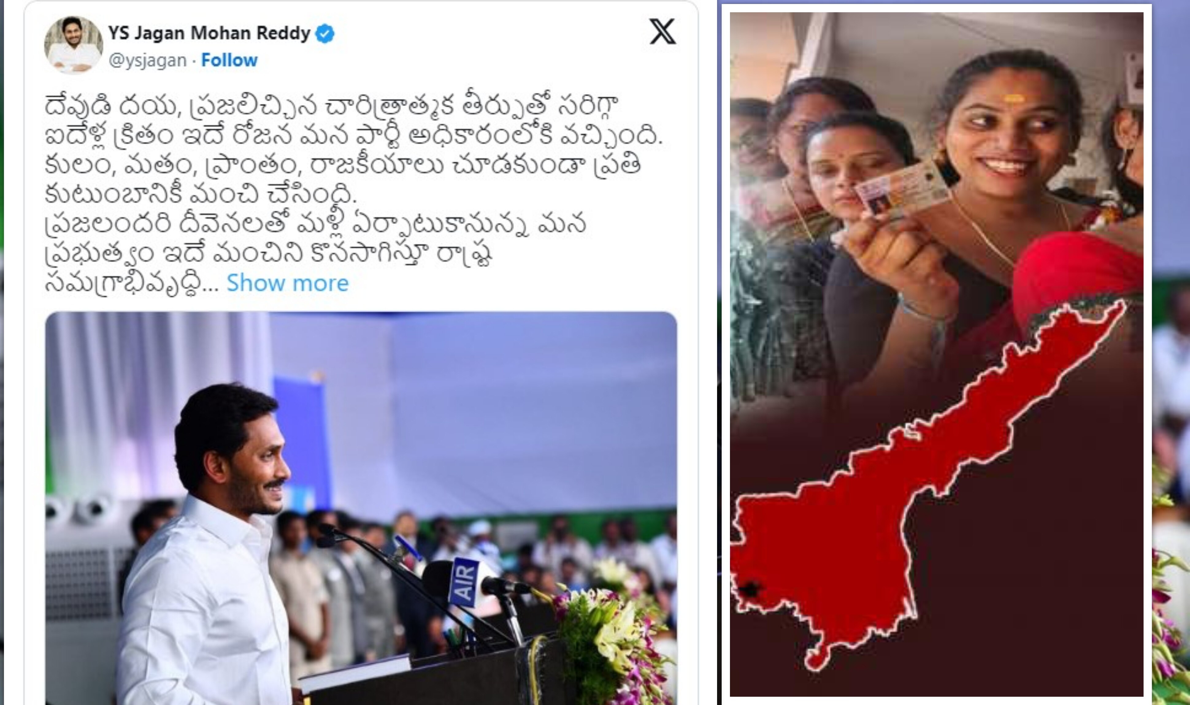 'దేవుడి దయ, ప్రజలిచ్చిన చారిత్రాత్మక తీర్పుతో సరిగ్గా ఐదేళ్ల కిందట ఇదే రోజున మన పార్టీ అధికారంలోకి వచ్చింది. కులం, మతం, ప్రాంతం, రాజకీయాలు చూడకుండా ప్రతి కుటుంబానికీ మంచి చేసింది. ప్రజలందరి దీవెనలతో మళ్లీ ఏర్పాటుకానున్న మన ప్రభుత్వం ఇదే మంచిని కొనసాగిస్తూ రాష్ట్ర సమగ్రాభివృద్ధి దిశగా మరిన్ని అడుగులు ముందుకేస్తుంది' అని జగన్ 'ఎక్స్'లో పోస్టు చేశారు. ఈ సందర్భంగా ముఖ్యమంత్రిగా తాను ప్రమాణస్వీకారం చేస్తున్న ఫొటోను కూడా జగన్ పంచుకున్నారు.
