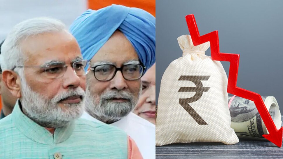 2004లో మన్మోహన్ సింగ్ అధికారం చేపట్టినప్పుడు డాలర్ విలువ 45.45 రూపాయలుగా ఉండగా.. 2014లో ఆయన పదవీ కాలం ముగిసే సమయానికి డాలర్ విలువ 58.58 రూపాయలకు చేరింది. అంటే 10ఏళ్లలో రూపాయి విలువ దాదాపు 29శాతం మేర తగ్గింది. మోదీ హయాంలో రూపాయి విలువ వేగంగా ఉంది. అంటే రూపాయి పతనం మొత్తం 29 శాతం మాత్రమే. ఇది మోదీ ప్రభుత్వంలో జరిగిన 52 శాతం పతనంతో పోలిస్తే చాలా తక్కువ అని చెప్పాలి. ఈ రెండింటిని సరిపోల్చితే మోదీ పాలనలో రూపాయి విలువ పడిపోయే వేగం మన్మోహన్ సింగ్ కాలంతో పోలిస్తే దాదాపు రెట్టింపు ఎక్కువ అని చెప్పాలి. అందుకే రూపాయి ఎందుకు ఇంత బలహీనపడింది అనే ప్రశ్న మోదీ హయాంలో ఎక్కవగా వినిపిస్తోంది.