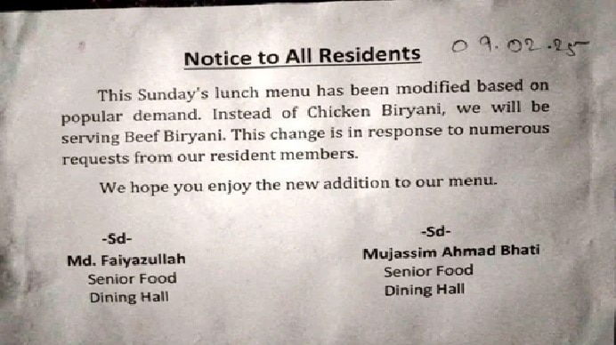 అలీఘర్ ముస్లిం యూనివర్శిటీలో ఇప్పుడు వాతావరణం వేడెక్కుతోంది. యూనివర్శిటీలోని సర్ షా సులైమాన్ హాల్లో ఇవాళ ఆదివారం మద్యాహ్నం లంచ్లో బీఫ్ బిర్యానీ వడ్డించాలంటూ జారీ అయిన ఇంటర్నల్ నోటీసు సోషల్ మీడియాలో వైరల్ అవుతోంది. వర్శిటీకు చెందిన ఇద్దరు అధికారులు ఈ నోటీసు జారీ చేశారు. ఈ నోటీసు సారాంశం ఏంటంటే..ఆదివారం లంచ్ మెనూ మార్చబడింది. డిమాండ్ మేరకు చికెన్ బిర్యానీ బదులు బీఫ్ బిర్యానీ వడ్డించబడుతుంది అని ఉంది. ఈ నోటీసు సోషల్ మీడియాలో వైరల్ కావడంతో వివాదం మొదలైంది. వర్శిటీలో కూడా అంతర్గతంగా విద్యార్ధుల మధ్య ఘర్షణ వాతావరణం నెలకొంది. మొదట్లో ఈ వివాదంపై యూనివర్శిటీ అధికారులు ఎలాంటి ప్రకటన చేయలేదు. ఆ తరువాత పరిస్థితి తీవ్రం కావడంతో వర్శిటీ అధికారులు వివరణ ఇచ్చుకున్నారు.