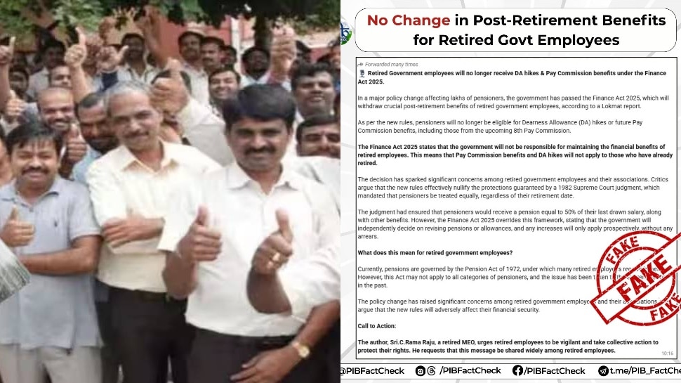 ఆర్థిక చట్టం-2025 ప్రకారం.. ఇతర కారణాలతో తొలగించిన ప్రభుత్వ ఉద్యోగుల విషయంలో మాత్రమే పదవీ విరమణ ప్రయోజనాలు (రిటైర్మెంట్ బెనిఫిట్స్) నిలిచిపోతాయని పీఐబీ ఫ్యాక్ట్చెక్ తెలిపింది. సీసీఎస్ (పెన్షన్) రూల్స్, 2021లోని రూల్ 37ను సవరించినట్లు వెల్లడించింది. ఈ ఏడాది మే నెలలో ఇప్పటికే అధికారిక ప్రకటన వెలువరించామని.. ప్రస్తుతం వాట్సప్లో విస్తృతమవుతున్న ప్రచారం పూర్తిగా అబద్ధమని స్పష్టం చేసింది.