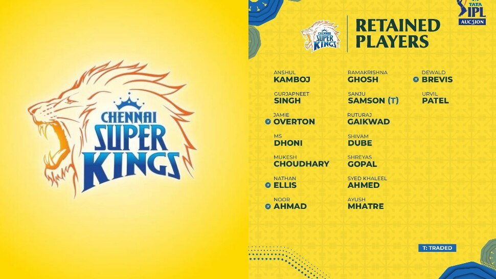 చెన్నై సూపర్ కింగ్స్ (CSK) రిటెన్షన్ ప్లేయర్ల లిస్ట్: రుతురాజ్ గైక్వాడ్, ఆయుష్ మాత్రే, డెవాల్డ్ బ్రెవిస్, ఎంఎస్ ధోనీ, ఉర్విల్ పటేల్, సంజు శాంసన్ (RR నుంచి ట్రేడింగ్), శివమ్ దూబే, జామీ ఓవర్టన్, రామకృష్ణ ఘోష్, నూర్ అహ్మద్, ఖలీల్ అహ్మద్, అన్షుల్ కాంబోజ్, గుర్జన్ప్రీత్ సింగ్, నాథన్ ఎల్లిస్, శ్రేయాష్ గోపాల్, ముకేశ్ చౌదరి.