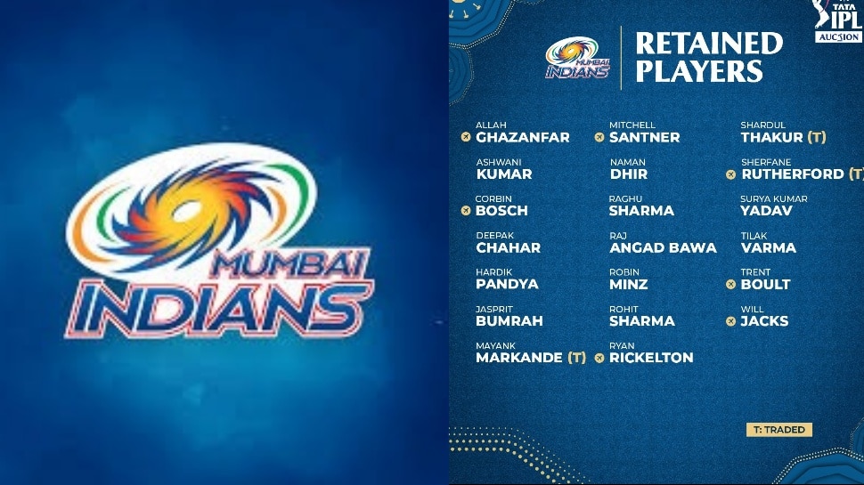 ముంబై ఇండియన్స్ (MI) రిటెన్షన్ ప్లేయర్ల లిస్ట్: అల్లా ఘజన్ఫర్, మిచెల్ సాంట్నర్, శార్దూల్ ఠాకూర్ (లక్నో నుంచి ట్రేడింగ్), అశ్వనీ కుమార్, నమన్ ధీర్, షెర్ఫానే రూథర్ఫర్డ్ (ట్రేడింగ్), కార్బిన్ బాష్, రఘు శర్మ, సూర్యకుమార్ యాదవ్, దీపక్ చహర్, రాజ్ అంగద్బవా, తిలక్ వర్మ, హార్దిక్పాండ్యా, రాబిన్ మింజ్, ట్రెంట్ బౌల్ట్, జస్ప్రీత్ బుమ్రా, రోహిత్ శర్మ, విల్ జాక్స్, మయాంక్ మార్కండే (ట్రేడింగ్), రియాన్ రికెల్టన్.