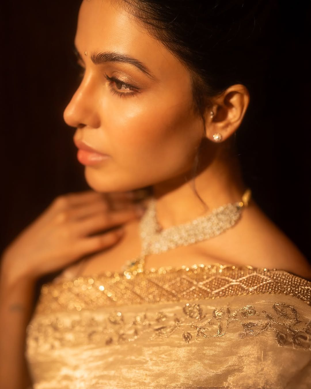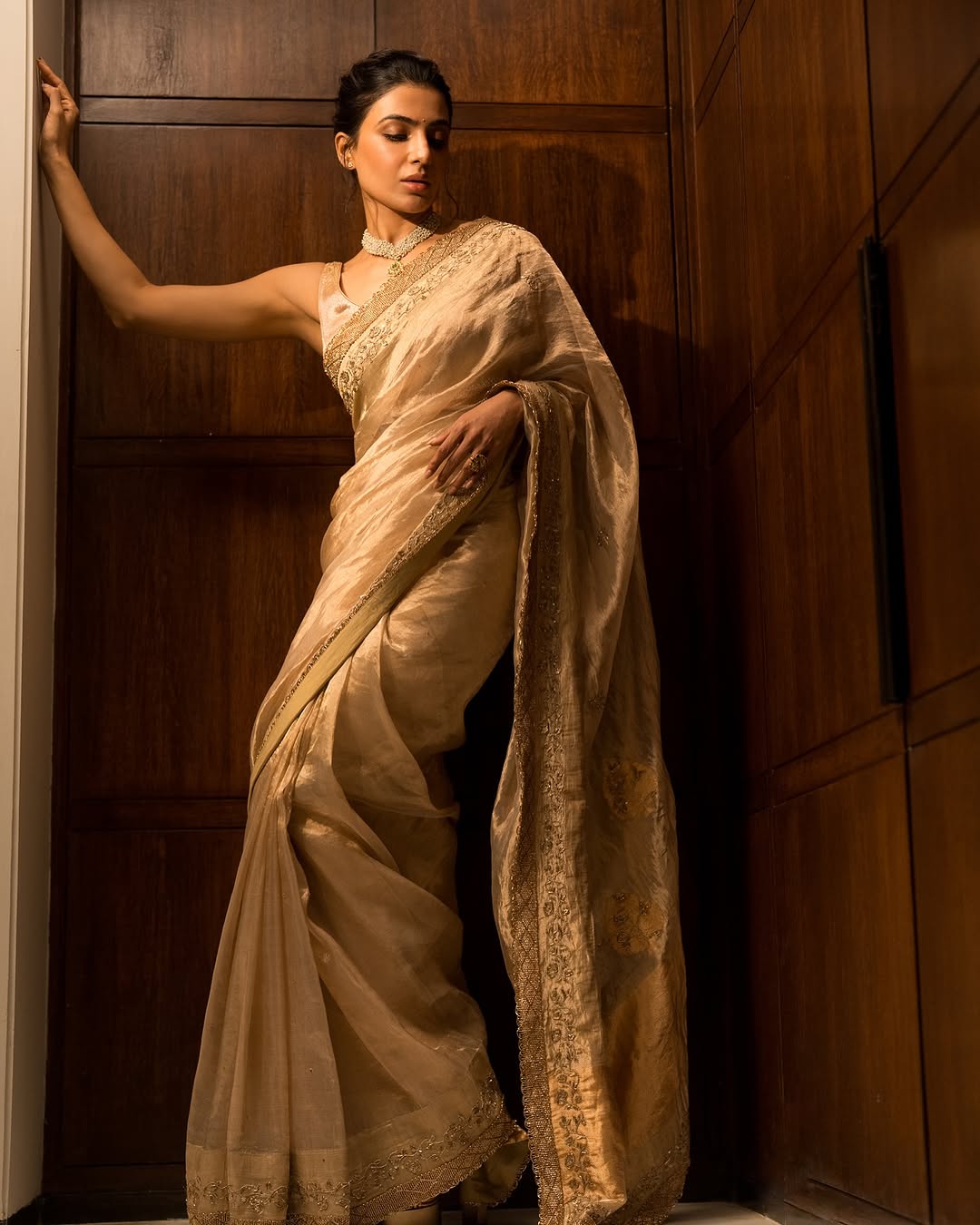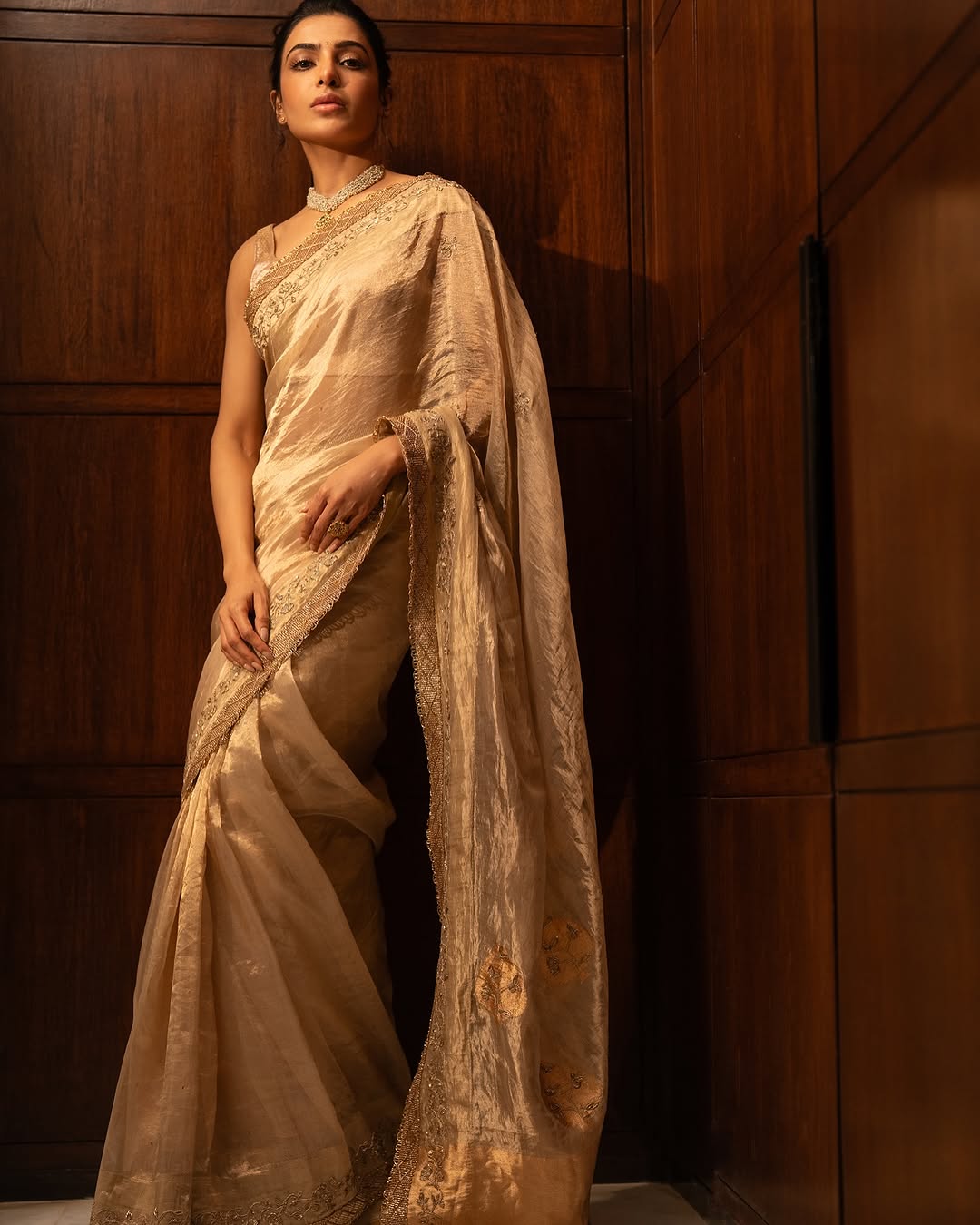 ఈ క్రమంగా తాజాగా సమంత షేర్ చేసిన ఫోటోలు వైరల్ అవుతూ అందరినీ ఆకట్టుకుంటున్నాయి. ఈ ఫోటోలలో బంగారపు రంగు చీరలో మెరిసిపోయింది సమంత.