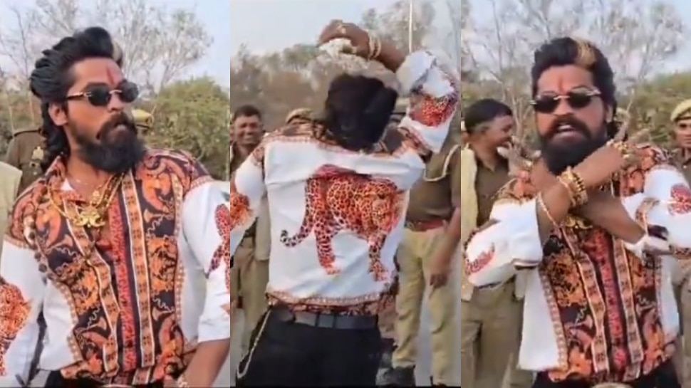అచ్చం పుష్ప సినిమాలో అల్లు అర్జున్ మాదిరిగా డ్రెస్ వేసుకొవడం మాత్రమే కాకుండా.. డైలాగ్ లు కూడా చెబుతూ అక్కడున్న పోలీసుల్ని షాకింగ్ కు గురిచేస్తున్నాడు. పుష్ప మాదిరిగా గడ్డం, పుష్ప స్టయిల్, పుష్ప లా హావా భావాలతో ఆకట్టుకున్నాడు.