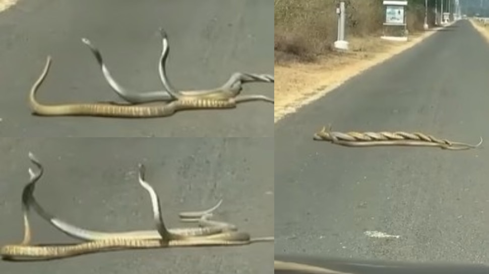 Three snakes Romance on Road video: సాధారణంగా పాముల్ని చూడగానే ప్రాణాల మీద ఆశఉన్న ఎవరైన భయంతో దూరంగా పారిపోతుంటారు. కానీ కొంతమంది మాత్రం పాములు కన్పించగానే స్నేక్ సొసైటీ వాళ్లకు సమాచారం ఇస్తారు. పాములకు ఆపద కల్గించరు. పాములకు హనీ తలపెడితే కాలసర్పదోషం చుట్టుకుంటుందని భావిస్తారు. పాముల వీడియోలు నెట్టింట వైరల్ గా మారుతుంటాయి. విషపూరీతమైన పాములకు చెందిన వీడియోలు తరచుగా నెట్టింట వైరల్ అవుతుంటాయి.