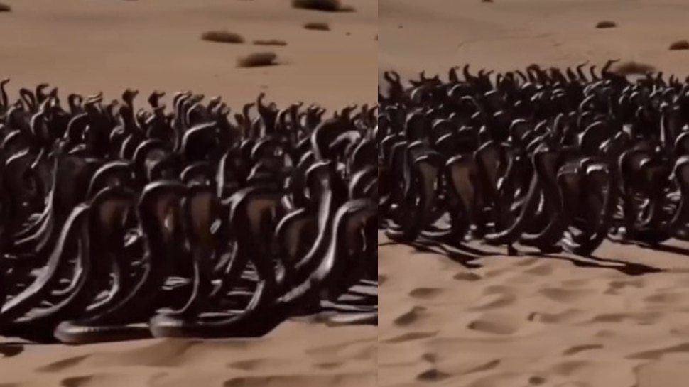 ఈ క్రమంలో ప్రస్తుతం ఎడారిలో పాముల గుంపుకు చెందిన ఒక వీడియో నెట్టింట వైరల్గా మారింది. దీనిలో నల్లని కోబ్రా పాములు అవేవో సైన్యంలా ఏర్పడి గుంపులుగా ..మరో రాజ్యం మీద దాడికి వెళ్తున్నట్లు వేగంగా వెళ్తున్నాయి. అది చూసేందుకు కూడా ఎంతో భయంకరంగా ఉంది.