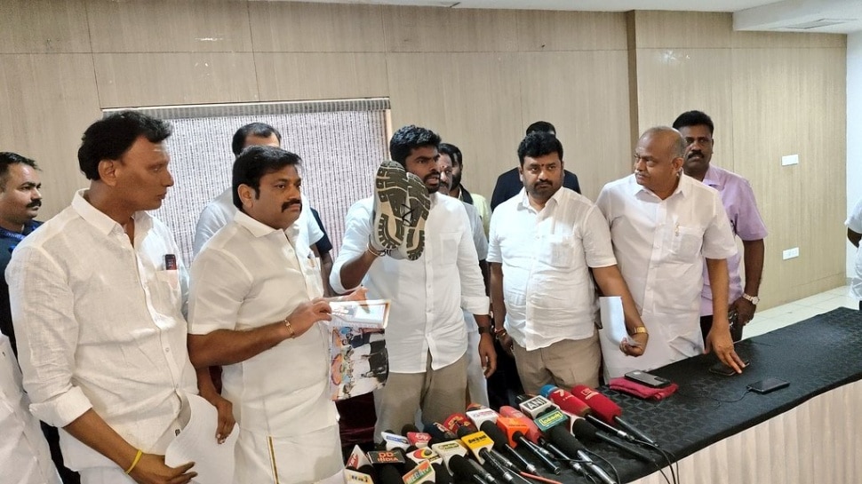 #WATCH | During a press conference, Tamil Nadu BJP President K Annamalai removed his shoe and said, "From tomorrow onwards until the DMK is removed from power, I will not wear any footwear..."