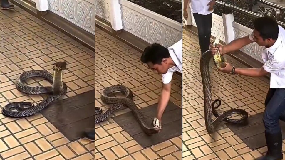 అతను కనీసం స్టిక్ కూడా లేకుండా కోబ్రాను పట్టుకునేందుకు వచ్చాడు. కింగ్ కోబ్రాను చాకచక్యంగా అదేదో.. కోడినో మరేంటో దాన్ని పట్టుకున్నట్లు .. కోబ్రా మెడను ఒక్కసారిగా పట్టుకున్నాడు. అక్కడున్న వారంత చూసి షాక్ అయ్యారు. కోబ్రాను చూసి అక్కడున్న వారంత భయంతో పరుగులు పెట్టారు.