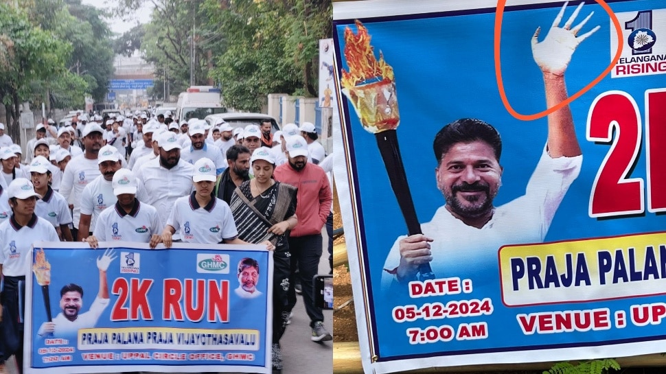 GHMC 5K Run: కాంగ్రెస్ ఏడాది పాలన పూర్తయిన సందర్భంగా నిర్వహిస్తున్న తెలంగాణ ప్రజా పాలన వారోత్సవాల్లో ఒక ఫ్లెక్సీ కలకలం రేపింది. రేవంత్ రెడ్డికి సంబంధించిన బ్యానర్లో చేయి దయ్యం చేయిలాగా కనిపించడం చర్చనీయాంశంగా మారింది. దానికి సంబంధించిన వీడియో, ఫొటో సామాజిక మాధ్యమాల్లో వైరల్గా మారింది. వెంటనే తప్పును గ్రహించిన అధికారులు బ్యానర్ను తొలగించారు. ఈ ఫ్లెక్సీ వివాదం రాజధాని హైదరాబాద్లో చర్చనీయాంశంగా మారింది.