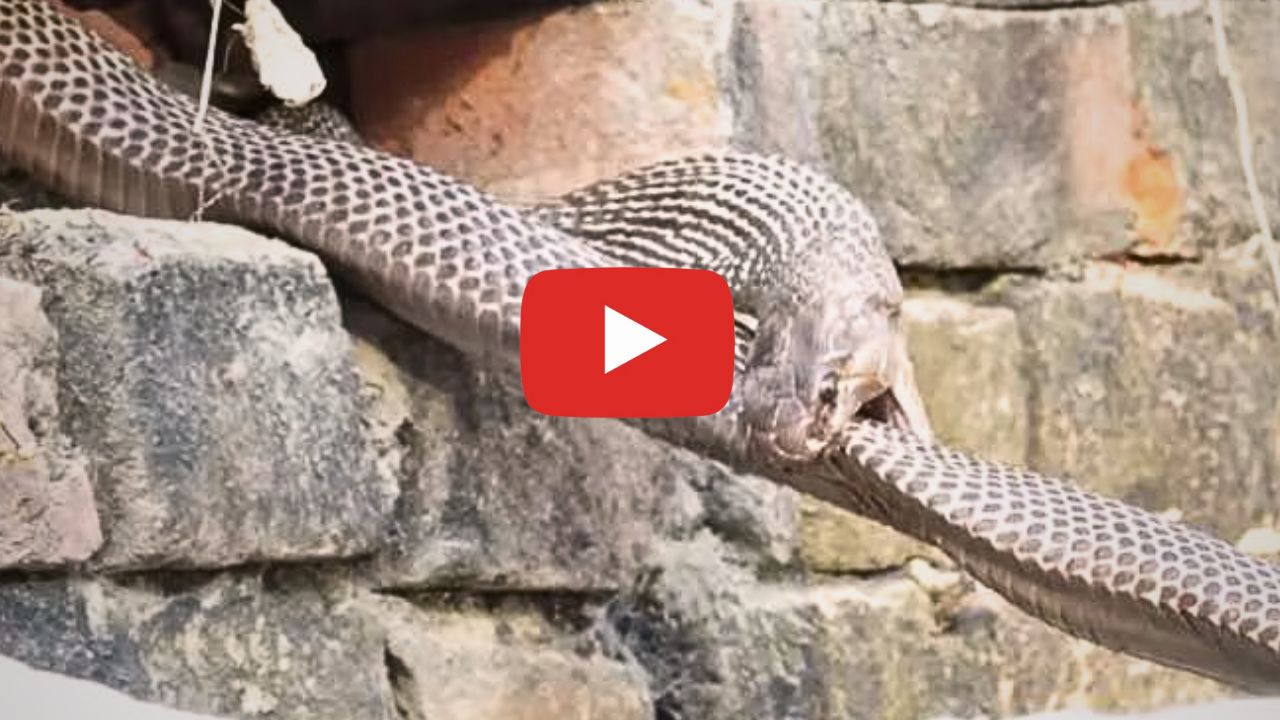 Very Angry King Cobra Attacked Himself Viral Video Watch Now: ఊళ్లలో వర్షం పడితే పాములు అప్పుడప్పుడు సయ్యాటలు అడుతూ ఉండడం చాలా సార్లు చూసి ఉంటారు.. ఈ సమయంలో అడ్డొచ్చే జీవులను అవి దాడి చేసి వాటిని తినడం కూడా చూసి ఉంటారు. కానీ మీరు ఎప్పుడైనా అదే భారీ పాము తనను తినడం చూశారా? అయితే ప్రస్తుతం ఇలాంటి సంఘటనకు సంబంధించిన ఓ పాములు వీడియో సోషల్ మీడియాలో తెగ వైరల్ అవుతోంది. ప్రస్తుతం ఓ వీడియోలో గోడలో దూరిన భారీ కింగ్ కోబ్రా తనను తాను కోపంలో తినేయడం అందరినీ ఆశ్చర్యానికి గురి చేస్తోంది. దీనికి సంబంధించిన వీడియో సోషల్ మీడియాలో తెగ వైరల్ అవుతోంది.