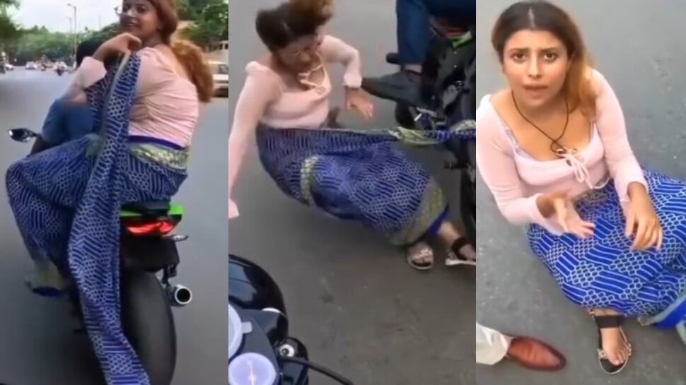 woman falls from running bike video: మహిళలు చాలా మంది బైక్ ల మీద జర్నీలకు ఇష్టపడుతుంటారు. మనం తరచుగా అమ్మాయిలు వాళ్ల ఫ్యామిలీ వాళ్లు, లేదా ఫ్రెండ్స్ తో బైక్ ల మీద వెళ్తుండటం చూస్తుంటాం. అంతేకాకుండా.. కొన్నిసార్లు.. లవర్ లతో కూడా చాలా మంది బైక్ ల మీద వెళ్తు రొమాన్స్ లకు దిగుతుంటారు. అయితే.. అమ్మాయిలు జీన్స్ , పంజాబీ డ్రెస్ లు, ఇతర డ్రెస్ లు వేసుకుని బైక్ ల మీద వెళ్తుంటే పెద్దగా ప్రమాదాలు జరగవు.