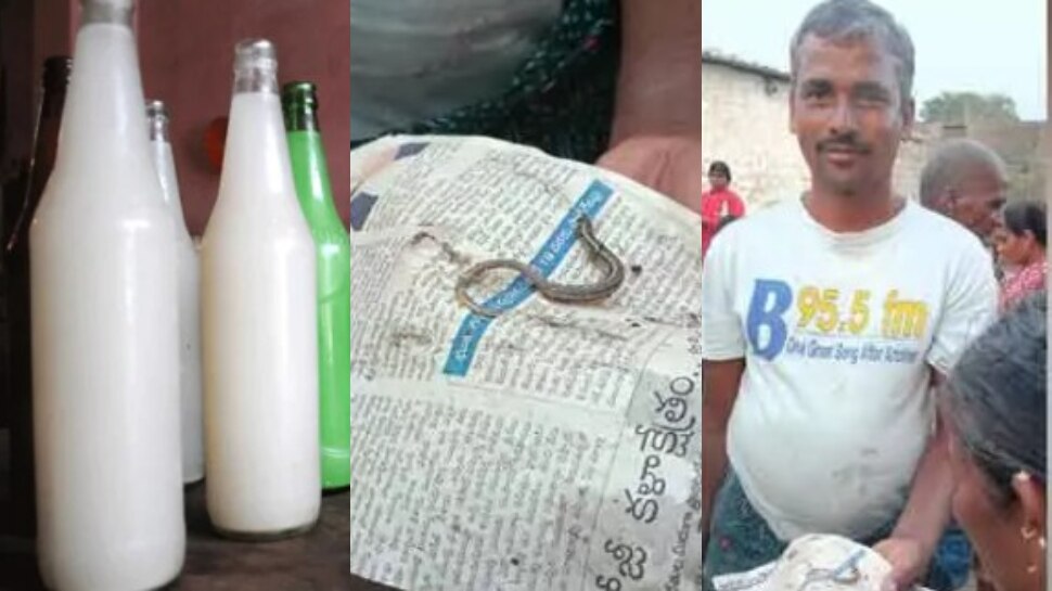 Snake found in toddy bottle video: సాధారణంగా చాలా మందికి లిక్కర్ లేదా కల్లు తాగే అలవాటు ఉంటుంది. ముఖ్యంగా కూలీ పనులకు వెళ్లేవారు ప్రతిరోజు కూడా కల్లుతుంటారు. కొంత మంది యువత ఉదయాన్నే మంచి కల్లు తాగేందుకు ఈత చెట్ల దగ్గరకు వెళ్తుంటారు. కల్లు తాగితే... ఆరోగ్యానికి మేలు కలుగుతుంది. అయితే.. ఇటీవల చాలా చోట్ల కల్లీ కల్లు ఘటనలు వార్తలలో ఉంటున్నాయి. కల్తీ కల్లు తాగడం వల్ల చాలా మంది మరణిస్తున్నారు.