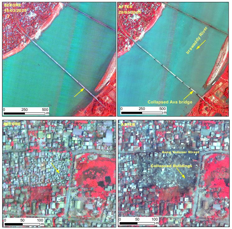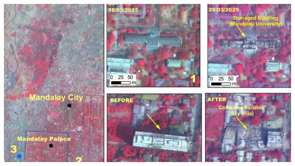 అయితే, ఈ ఉపగ్రహం సాగైంగ్లోని మా క్సీ ఖానా పగోడా, మఠాలు ఇతర భవనాలు కూడా దెబ్బతిన్న విజువల్స్ తీసింది. ఇక ఈ ఇస్రో కార్టోసాట్-3 ఉపగ్రహం 2019 లో ప్రయోగించారు. 500 కిలోమీటర్ల ఎత్తు నుండి మయన్మార్ ప్రభావిత ప్రాంతాల చిత్రాలను సంగ్రహించింది. ఇందులో మయన్మార్లోని మండలే, సాగైంగ్లో కూలిపోయిన భవాలు, రోడ్లతోపాటు మరిన్ని చారిత్రక దృశ్యాలను సంగ్రహించింది. ఈ చిత్రాలతో గత నెల మార్చి 18వ తేదీ చిత్రాలను సరిపోలుస్తూ తీసిన ఫోటోలు ఇవి.