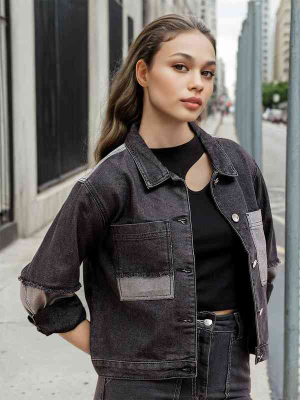 This is bold and artistic look!! Wearing the Freehand by The Indian Garage Co Colourblocked Crop Denim Jacket. The patchwork detail and cropped length gives this jacket effortless style for those fashionistas who want to make a statement. Dress it up with high-waisted jeans or skirts and add an urban chic style.