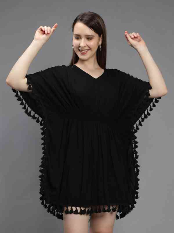 This Aditi Wasan Pure Cotton Kaftan Mini Dress combines elegance with everyday comfort. Featuring a flattering V-neck and kimono sleeves, it offers a stylish yet relaxed look. The breathable cotton fabric makes it ideal for hot weather, while the mini length adds a youthful, modern vibe perfect for casual outings or travel.